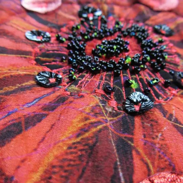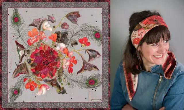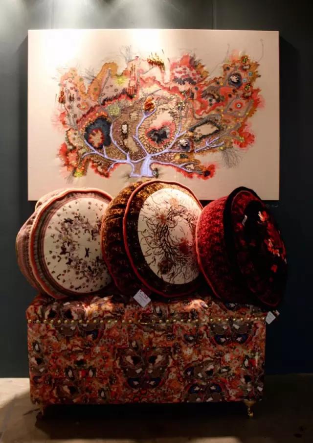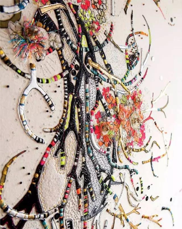 花卉也是Louise的一個重要創(chuàng)作題材。這些花卉并非我們常見的那些,乍一看有些另類,更像是在刺繡的平面上完成一幅幅令人贊嘆的插花作品。在整體構(gòu)圖上,圖案多為放射狀,這使得作品的篇幅會比一般的大一些。