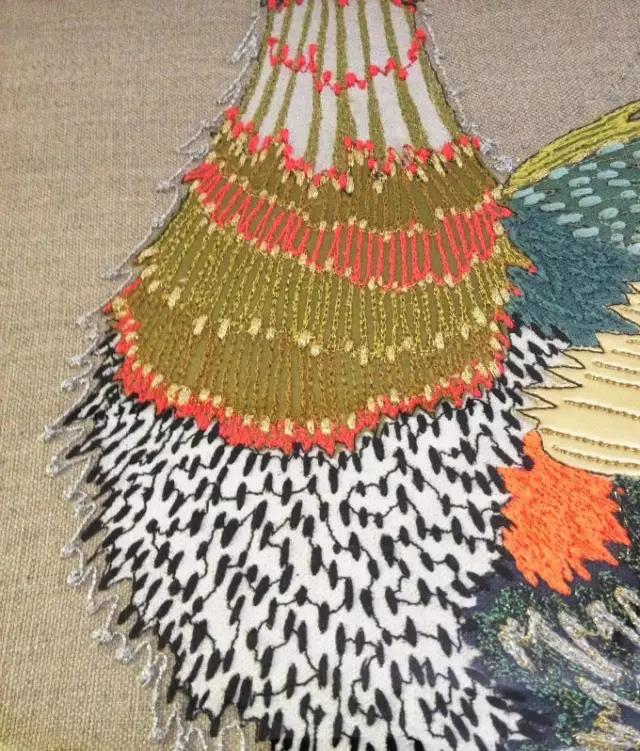 Louise在刻畫動物身體部分的肌理時,就需要耗費大量的精力,無論是對整體顏色的把控還是突顯立體效果的凹凸感。在作品中我們可以看到,許多地方用到了多種刺繡線的痕跡,以及貼花、縫珠、絎縫等技術(shù),讓作品中的動物變得生動了起來!