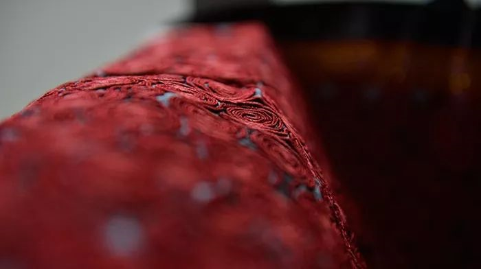 較粗的繡線使繡出的線圈緊實,線型流暢自然。通常使用在紋樣的外輪廓上,顏色往往與主題紋樣形成較大反差,更加突出破線繡的顏色鮮艷豐富和鏡面感的肌理效果。