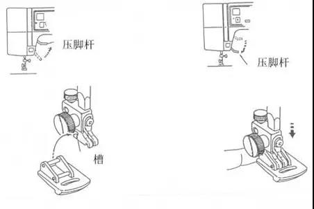 (1)抬起壓腳桿,將壓腳上的后橫桿放入壓腳座上的后槽中;