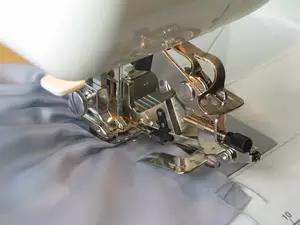 2、在縫紉機上裝上滾邊壓腳,選擇機針在中間位置的直線線跡。你可以選擇使用左邊或右邊滾槽。