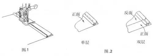 3、沿著左邊的槽將滾條縫在布料上(如圖1)。布料可以是一層,也可以是正面對正面合起來的雙層(如圖2)。