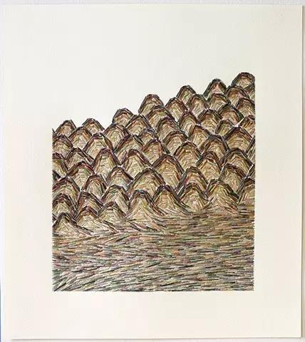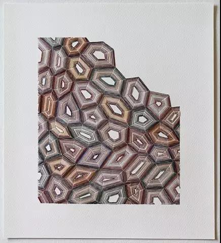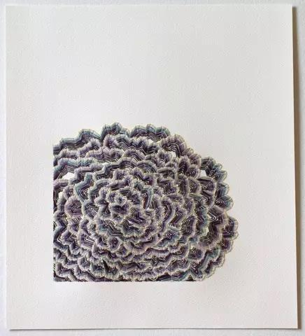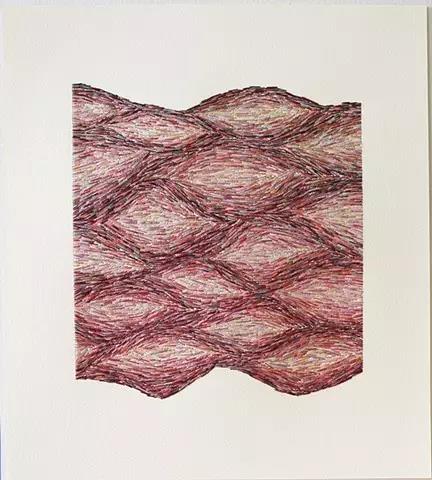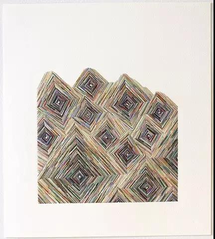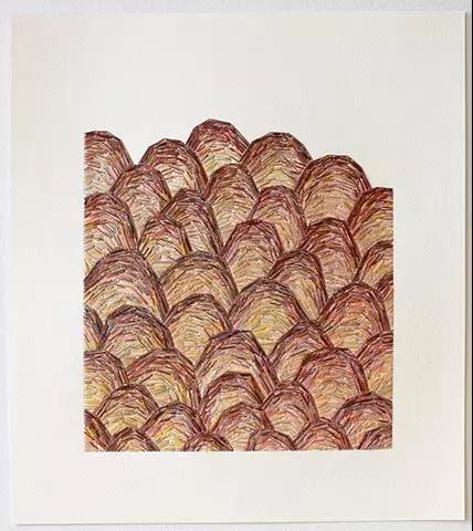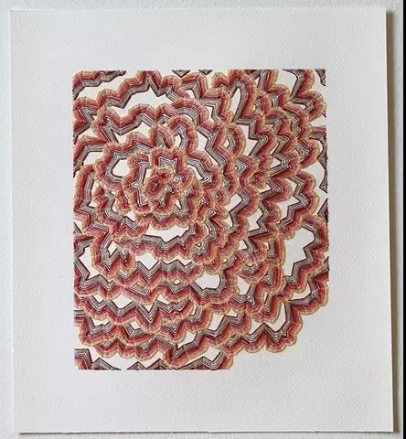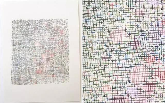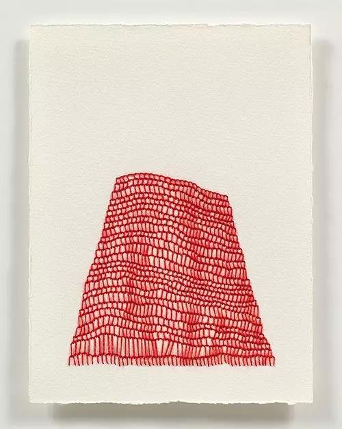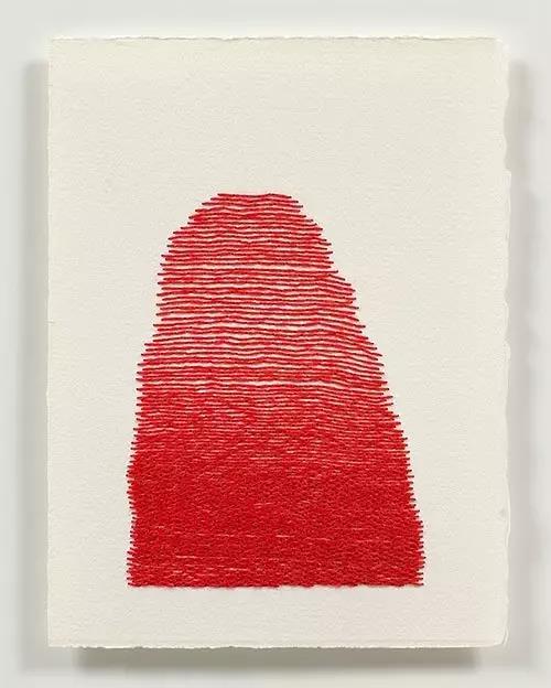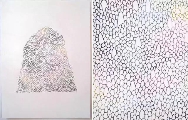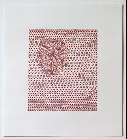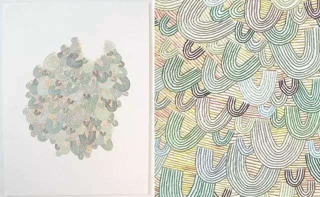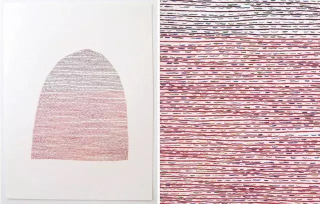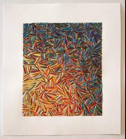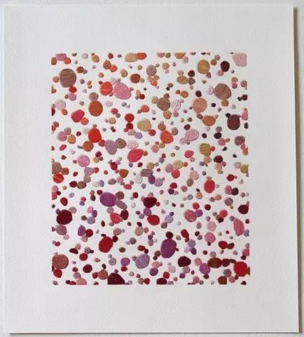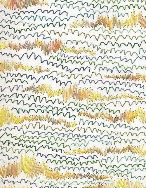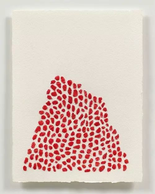 藝術家Emily Barletta穿針走線,在一張張紙上做刺繡。采用同心橢圓,十字,短線,弧線,折線,放射等單位拼成一個小整體。這些單位各有差異,放大看,那些微妙的變化,過渡以及組成仿若地上漸開漸盛的不知名野花,色彩斑斕,形態(tài)各異。迷人眼。