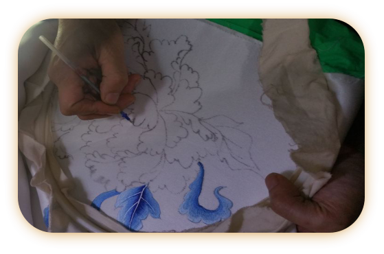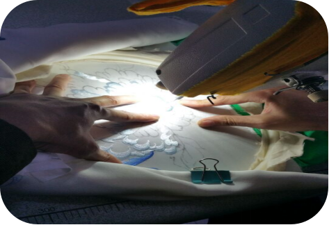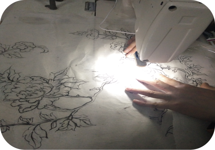 第四步:描線。印圖的時(shí)候難免會(huì)遇到?jīng)]有印好的情況,這時(shí)候需要用水洗筆描一下邊,方便后面的繡花,俗話說(shuō),磨刀不誤砍柴工不是么~